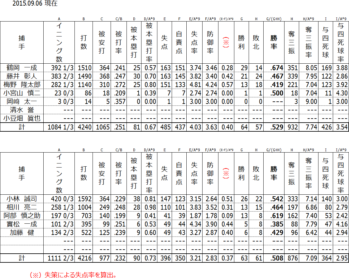 昨年と同様に、捕手別の防御率ほかの一覧表を http://baseball.yahoo.co.jp/npb/ から拾ったデータで作りました。